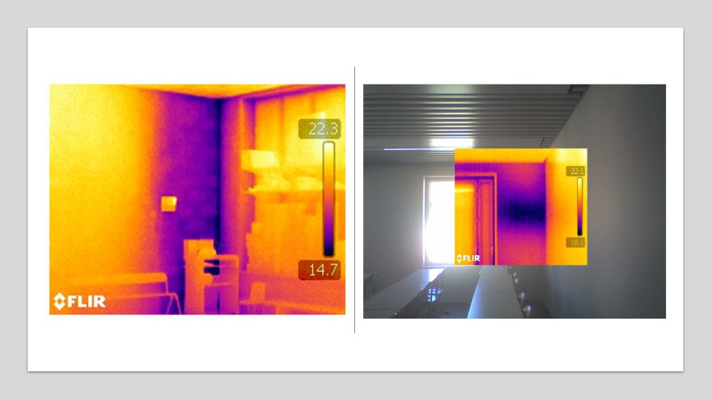 Il est particulièrement intéressant de combiner la thermographie infrarouge à un test d’infiltrométrie. En effet, la caméra va pouvoir matérialiser les échanges de chaleur dus à la circulation de l’air au travers et dans la paroi et ainsi mettre en évidence le fonctionnement thermique naturel du bâtiment via des images en forme de flammes)