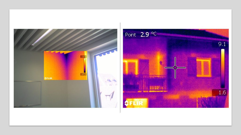 La caméra thermique permet de «voir» la température de surface des parois en détectant le rayonnement infrarouge qu’elles émettent. Elle permet donc, par analyse, de déceler d’éventuels problèmes d’isolation, manques d’isolants (ponts thermiques), qu’ils soient structurels (balcons, dalles intermédiaires, …) ou accidentels (dégradations d’isolant, défaut de pose, …).