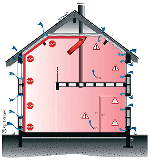 Une bonne étanchéité à l’air améliore le fonctionnement de la ventilation : elle évite que les fuites d’air parasites court-circuitent les flux d’air dans la maison. Elle garantit notamment le rendement des VMC double flux avec échangeur de chaleur. En effet, tout défaut d’étanchéité à l’air perturbe ce rendement, nuisant de fait à la qualité de l’air intérieur.