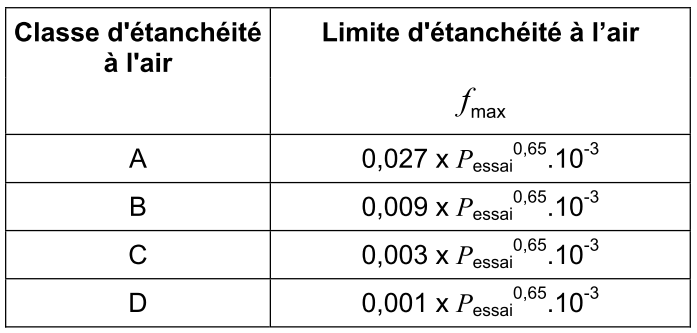 En dehors de ce label, aucune exigence de résultat n’est imposée si la valeur de perméabilité à l’air du réseau de ventilation dite « par défaut » est utilisée dans l’étude thermique. Toutefois, si une autre valeur est utilisée, (Classe A,B,C ou D) celle-ci devra être confirmée par une mesure.